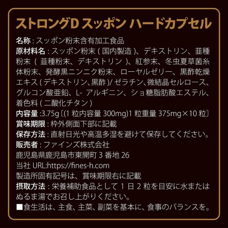 成分:スッポン粉末(国内製造)、デキストリン、韮種粉末(韮種粉末、デキストリン)、紅参末、冬虫夏草糸体粉末、発酵黒ニンニク粉末、ローヤルゼリー、黒酢乾燥エキス(デキストリン、黒酢)/ゼラチン、微結晶セルロース、グルコン酸亜鉛、L-アルギニン、ショ糖脂肪酸エステル、着色料(二酸化チタン)