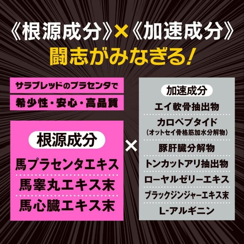 高品質の国産サラブレッドのプラセンタを配合し、馬睾丸エキス末、馬心臓エキス末と馬成分に特化した《根源成分》を配合した男性サポートグッズです。