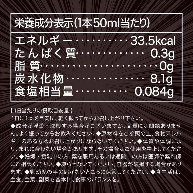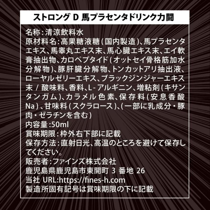 成分:高果糖液糖(国内製造)、馬プラセンタエキス、馬睾丸エキス末、馬心臓エキス末、エイ軟骨抽出物、カロペプタイド(オットセイ骨格筋加水分解物)、豚肝臓分解物、トンカットアリ抽出液、ローヤルゼリーエキス、ブラックジンジャーエキス末/酸味料、香料、L-アルギニン、増粘剤(キサンタンガム)、カラメル色素、保存料(安息香酸Na)、甘味料(スクラロース)、(一部に乳成分・豚肉・ゼラチンを含む)