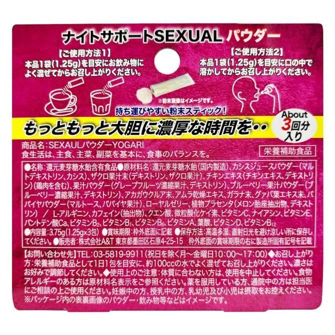 成分:還元麦芽糖水飴(国内製造)、カシスジュースパウダー(マルトデキストリン、カシス)、ザクロ果汁末(デキストリン、ザクロ果汁)、チキンエキス(チキンエキス、デキストリン)(鶏肉を含む)、果汁パウダー(グレープフルーツ濃縮果汁、デキストリン)、ブルーベリー果汁パウダー(ブルーベリー濃縮果汁、デキストリン)、アカガウクルア末、アムラ乾燥エキス、ガラナ末、グァバ酸エキス末、パパイヤパウダー(マルトース、パパイヤ果汁)、ローヤルゼリー、植物プラセンタ(メロン胎座抽出物、デキストリン)/L-アルギニン、カフェイン(抽出物)、クエン酸、微粒酸化ケイ素、ビタミンC、ナイアシン、ビタミンE、パントテン酸Ca、ビタミンB2、ビタミンB1、ビタミンB6、ビタミンA、葉酸、ビタミンD、ビタミンB12