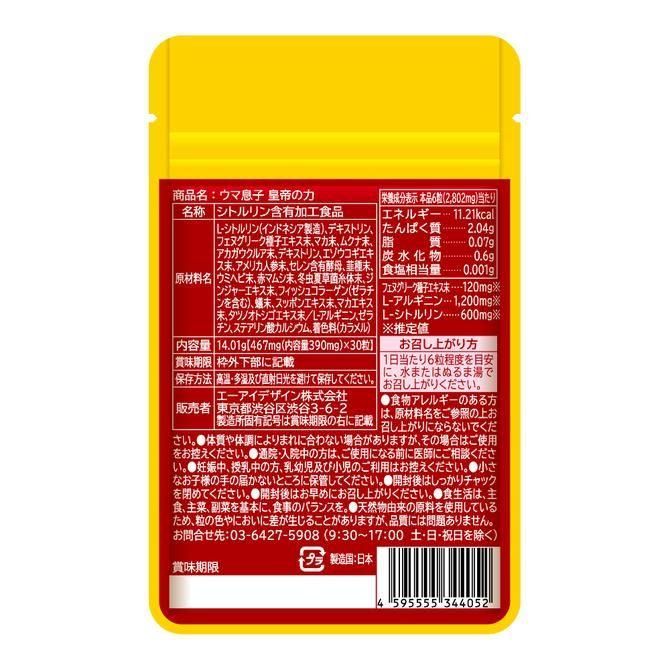 成分:L-シトルリン(インドネシア製造)、デキストリン、フェヌグリーク種子エキス末、マカ末、ムクナ末、アカガウクルア末、デキストリン、エゾウコギエキス末、アメリカ人参末、セレン含有酵母、韮種末、ウミヘビ末、赤マムシ末、冬虫夏草菌糸体末、ジンジャーエキス末、フィッシュコラーゲン(ゼラチンを含む)、蟻末、スッポンエキス末、マカエキス末、タツノオトシゴエキス末/L-アルギニン、ゼラチン、ステアリン酸カルシウム、着色料(カラメル)